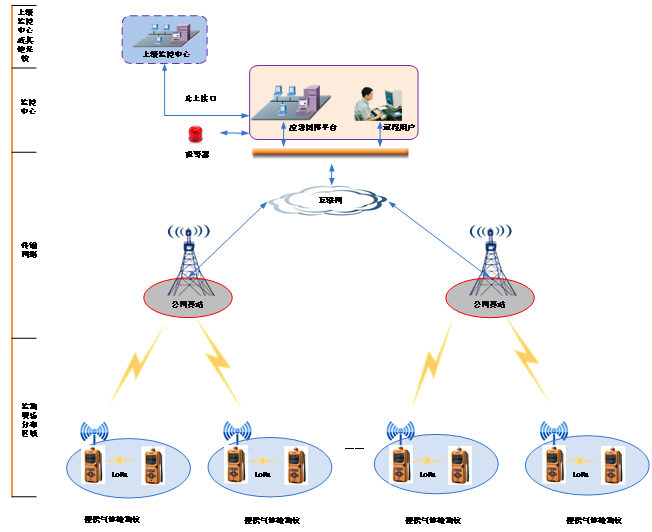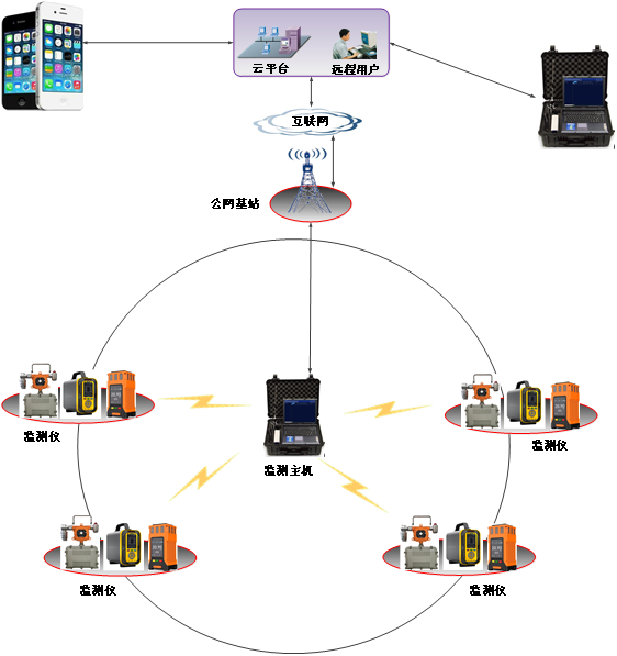 系统由区域监测主机,区域监测仪,便携气体检测仪、移动APP及云平台等部分组成。示意图如下:
