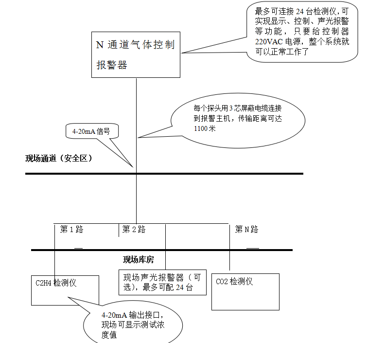 现场 C2H4和CO2变送器传过来的4-20mA信号全部连接到N通道气体控制报警器上,当某一路C2H4和CO2检测仪发出报警信号时(同时有继电器输出,可触发风机或乙醇产生机开关),提供给监控人员分级的声光报警,如果有需要,可以将监控主机通过网络将数据传输到其它监控中心。在现场可以实时显示C2H4和CO2的浓度,也可以在每一个探头附近装一个声光报警器,当现场发生报警时可以通知人员快速处理或撤离。