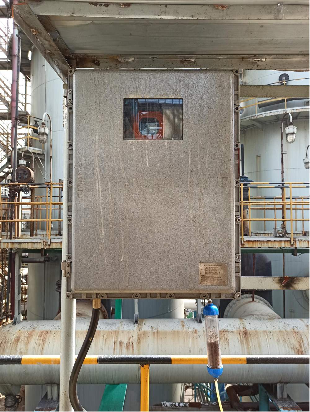 说明:由于现场排放尾气温度过高(100摄氏度以上),并且湿度太大,传感器直接测量会影响使用寿命,并且客户现场要求设备具有防爆;故加装TH-2000-C-EX预处理系统,内置抽气泵将尾气抽取到监测系统进行降温,除湿等操作后输送到MIC-600气室进行有害因子检测,并将检测后的信号通过4-20mA信号传输到PLC进行集中监控。